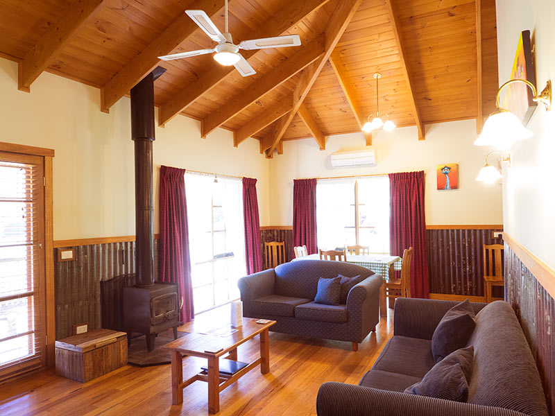 Sanctuary Park Cottages provide accommodation that is unique and private. We have 6 cottages on offer each suited for that unique getaway. The Loft is perfect for that romantic retreat for two, whilst our other cottages offer both two and three bedroom formats, beautifully set on the 20 acre property. Tastefully decorated in an Australian theme making use of natural woods and recycled materials, the Cottages are fully self contained and appointed with all essential facilities. Each cottage offers Queen size beds in all main bedrooms and single beds in the additional bedrooms. Luxurious spa baths, recycle air conditioning, fully equipped kitchens and laundries, large LED Tvs and DVD/CD players are all standard in each spacious cottage. And of course a fully functional wood fire for you cozy up on those cool nights is in each one of our lovely cottages.