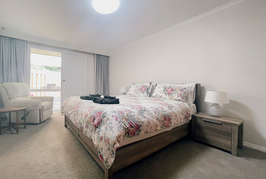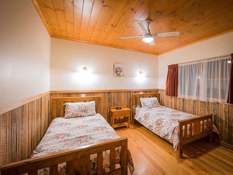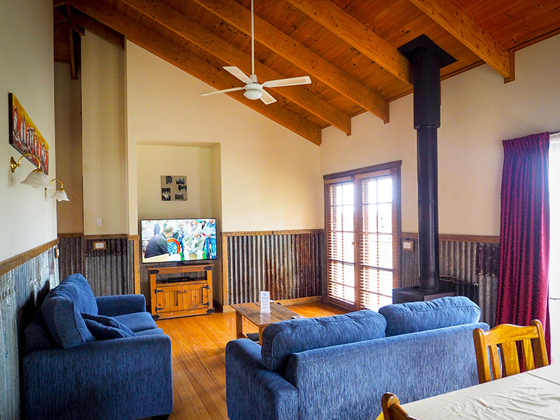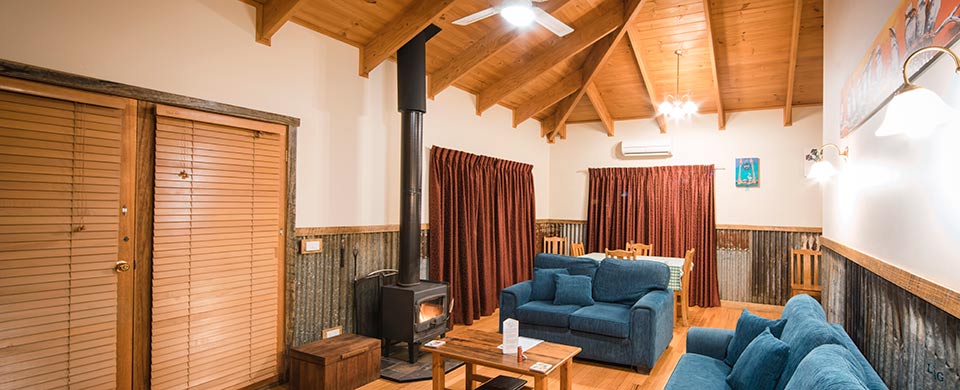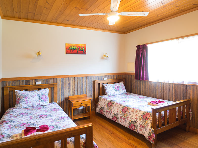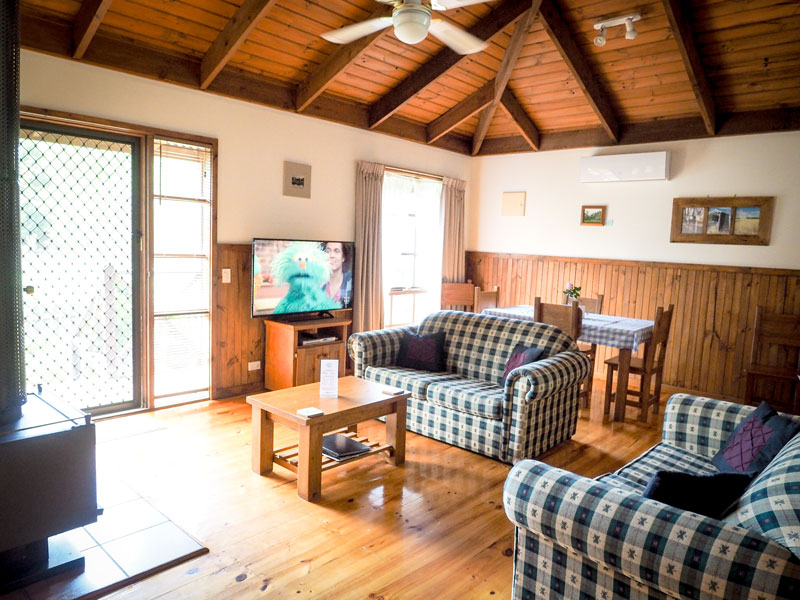 Two bedroom self contained cottages with recycle air conditioning, QS bed and 2 King single beds which, if preferred, can be joined to become a King double bed for couples. Includes three-corner spa, wood fire, brand new 50" Panasonic LED TV, DVD player and Panasonic Bluetooth HiFi System, fully equipped Kitchen and Laundry.